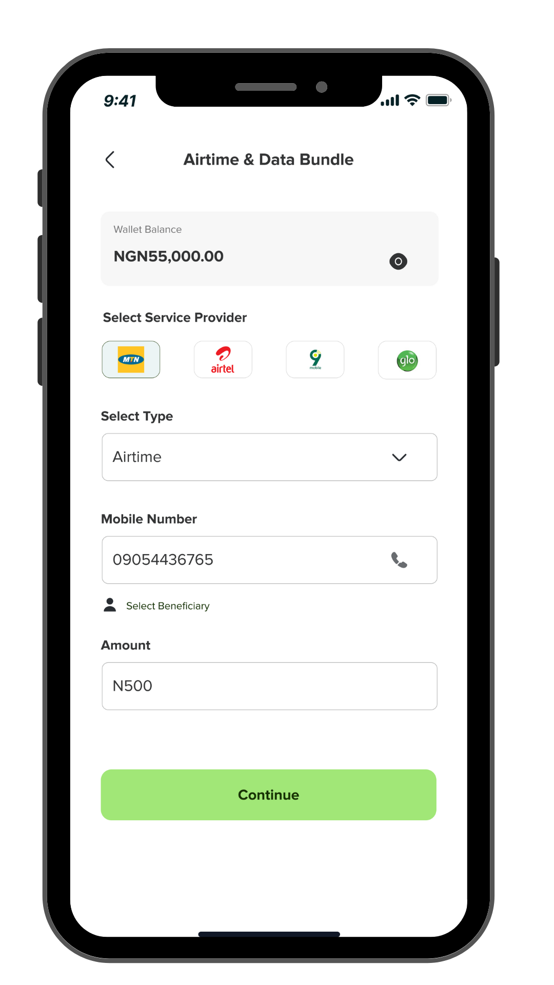 Choose the network provider, enter the phone number, input the amount.